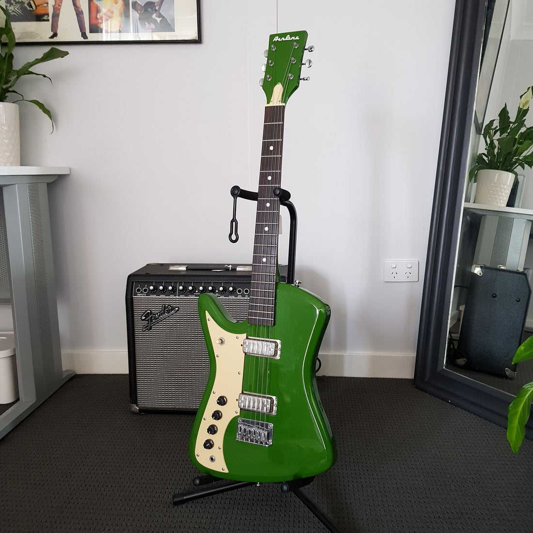 The Airline Bighorn was one of the early "student" guitars found in North American Catalogs in the 1960s. This model was available under the brands of Airline, Supro, Kay and many others. This new Eastwood release is based on the original 1960′s AIRLINE Bighorn, it features an updated adjustable bridge, truss rod and the modern popular Diamond Argyle single coil pickups.