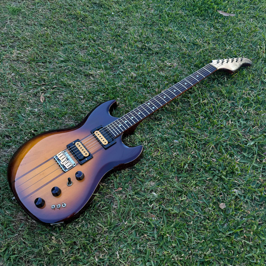 Made in Japan between 1979-1983 as part of the "Thor Sound" series (previously called "Tri Sound" until 1981, with this model still having six-a-side headstock it's likely an '81 model as they were changed to a three-a-side headstock in the same year according to this article on the TS-400 from Tym Guitars). Made up of a Chestnut/Maple/Walnut body, Maple neck with rosewood fretboard, 24 frets and two Aria Protomatic humbuckers with 1 volume and two tone knobs, 3-position switch, plus 2 mini switches for phase/antiphase for each pickup and another for parallel/series switching. This guitar has also just been fitted with brand new solid brass saddles.Â