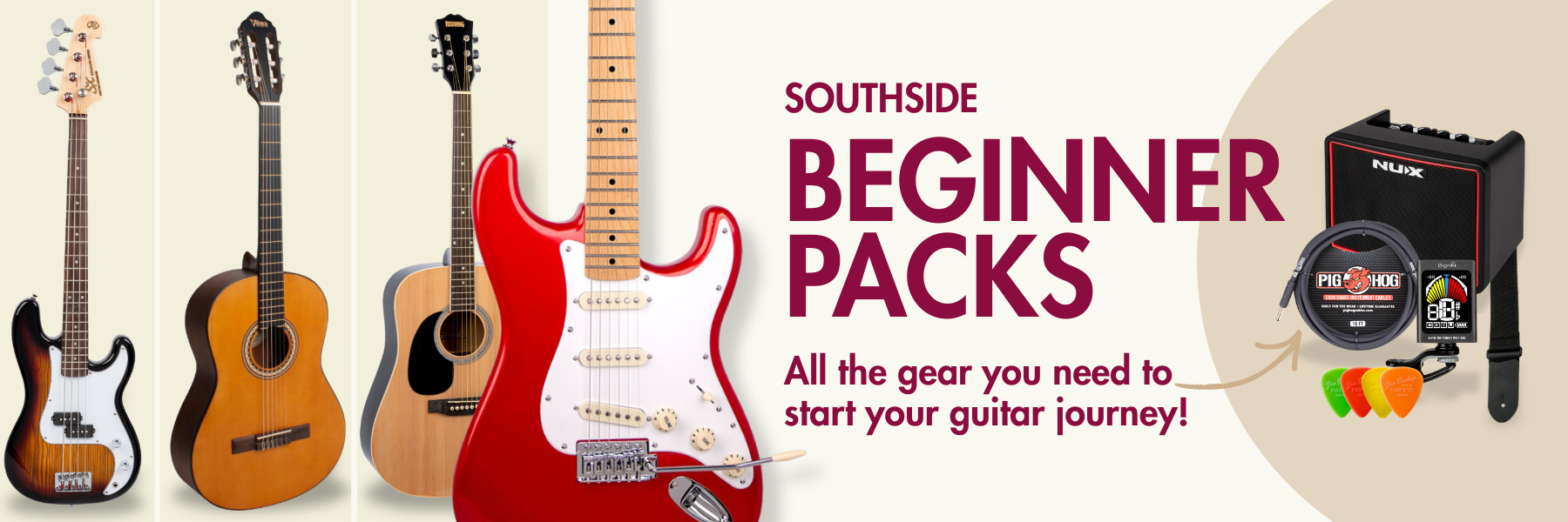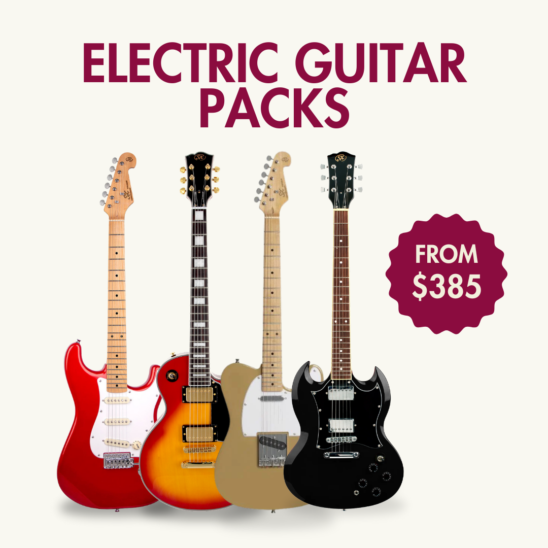 Explore our range of beginner guitar packs featuring four different body shapes, including Stratocaster, Telecaster, Les Paul, and SG. Each pack includes all the equipment you need to start playing straight away, including an amp, lead, tuner, gig bag, and picks.