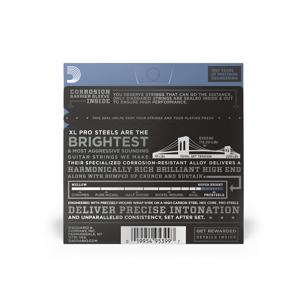 XL ProSteels are D’Addario’s brightest electric guitar strings. The unique, highly magnetic alloy in ProSteels offers a super bright, crunchy tone, and increased sustain. Made with a high carbon steel core and stainless steel wrap wire, ProSteels produce enhanced interaction with magnetic pickups, creating an extraordinarily bright tone that will cut through any mix.