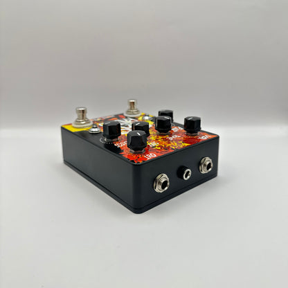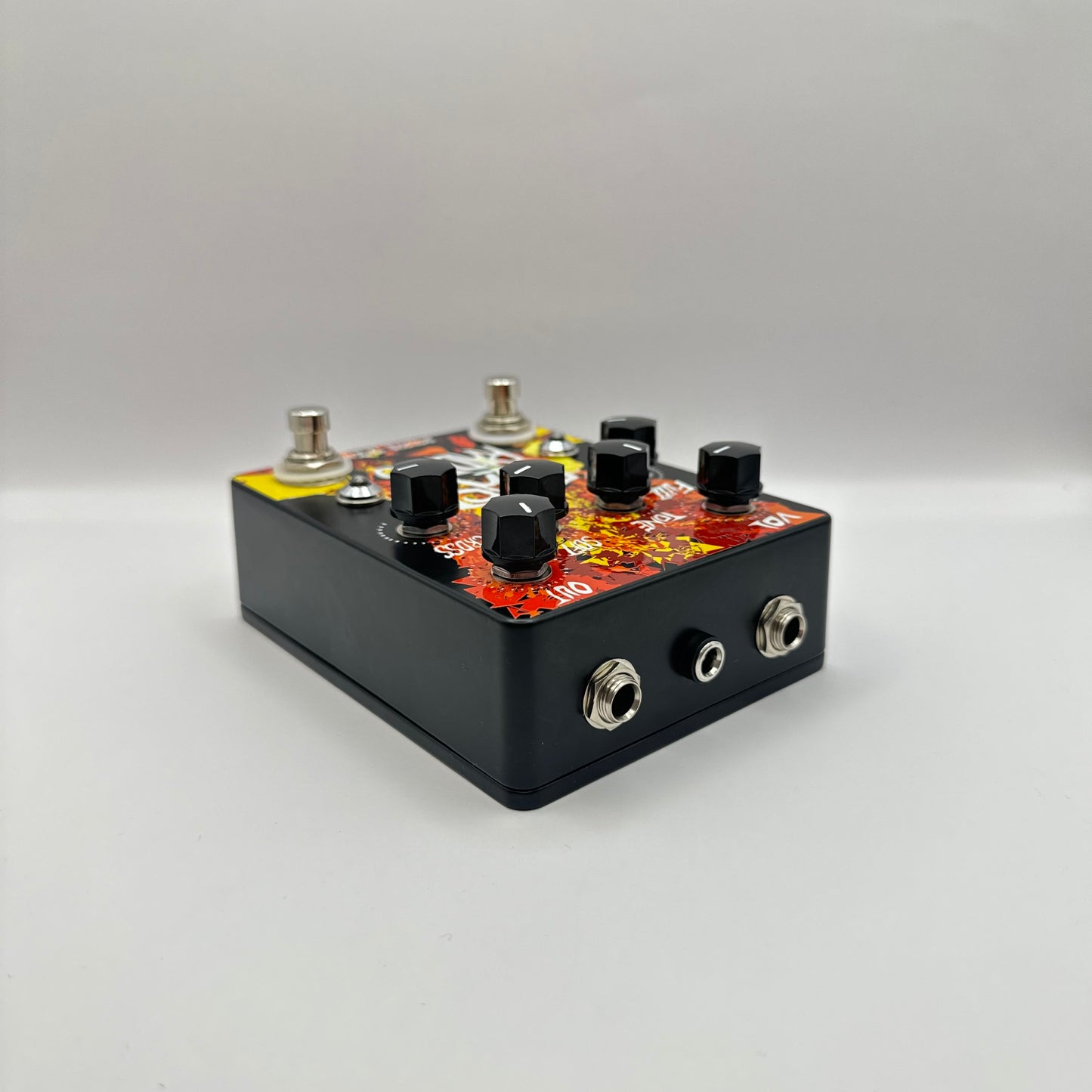 The Blast Radius is a dual fuzz/wavefolder-ish designed for crushing chords and walls-of-sound. The left side is based on an opamp Big Muff, but with different clipping diodes and a centre-flat tone knob (no annoying mid scoop!). The right side is a wavefolder/crossover distortion type thing, similar to the Tim Escobedo Tripple Fuzz. Whatever it actually is, what it does is add a bunch of interesting harmonic overtones to your sound that come through regardless of what is placed after it. What this means is it basically functions as a "Little More Fuzz" pedal that adds just a little more distortion to whatever its going into. Cant seem to squeeze any more gain out of your rig? This fixes that.