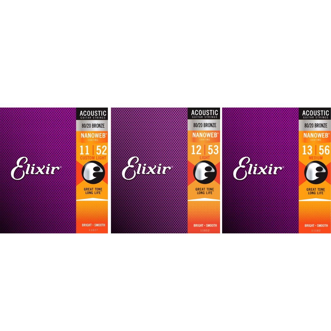 Elixir Nanoweb 80/20 Bronze Acoustic Guitar Strings E11102 Medium (13–56)