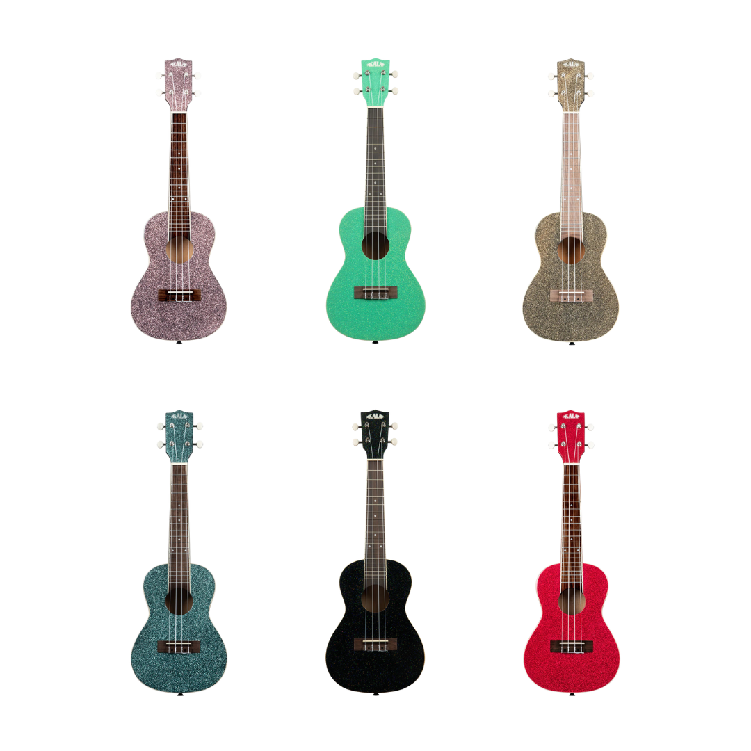 Welcome to the Roaring 2020s! 1920 would have been jubilant to have these glittery, glamorous ukuleles! Outlined in cream binding and gloss finish, they are hard to walk past.