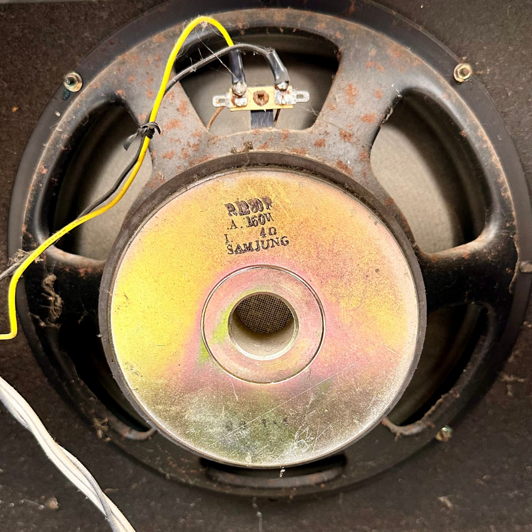 - In fair condition. The feet has carpet afixed and the fabric on the grille is flaking a bit.