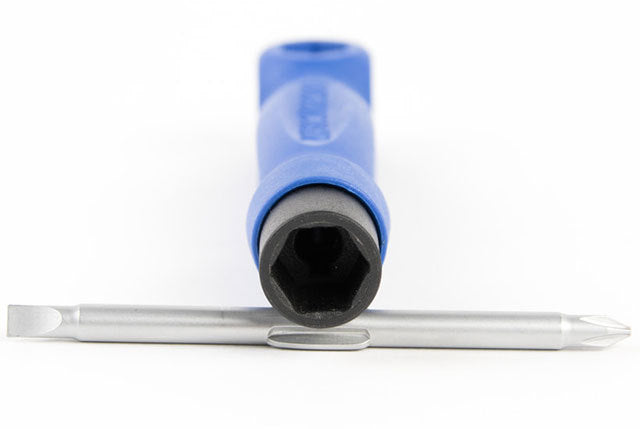 Music Nomad's patent pending, innovative design is perfect for tightening or loosening output jacks, strap locks, control pots, tuning machine bushings & screws. It features both a Phillips & flat blade screwdriver with our reversible shaft design and is engineered for the most popular hex wrench sizes: 10mm, 12mm, 14mm, 1/2" & 7/16".
