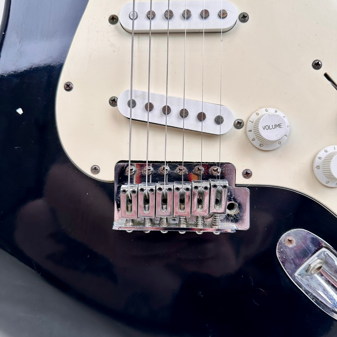 This Rockwood by Hohner LX-90L delivers the classic Strat layout with its maple neck, SSS pickup set and vintage-style tremolo, offering a straightforward and reliable platform for learning and everyday playing. Its black finish, aged cream plastics and well-played maple fretboard give it a worn-in character that suits a wide mix of tones and styles. Built as a no-fuss beginner-friendly Strat format, it provides solid playability at an accessible level.