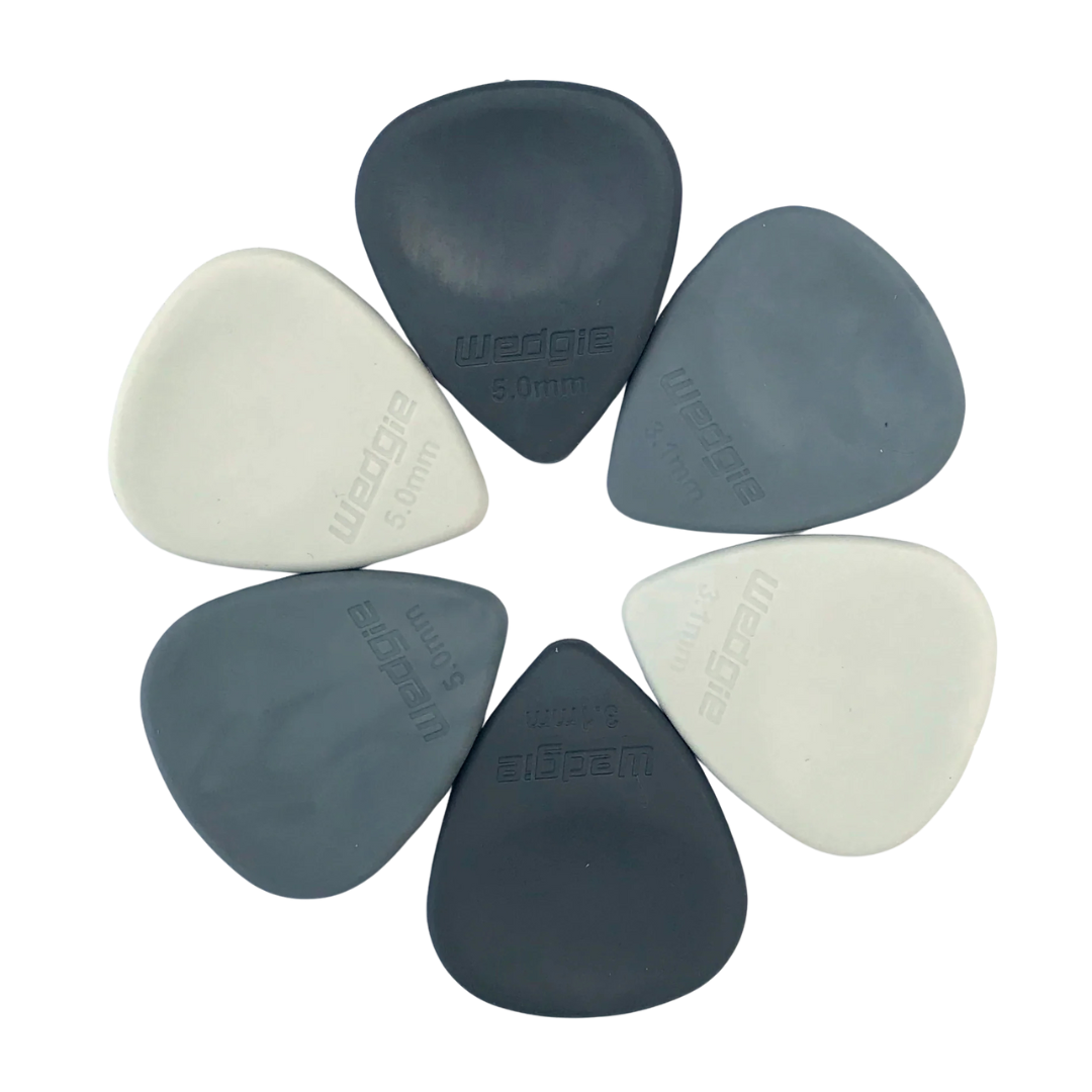 Wedgie Rubber picks will revolutionize your sound. The special elastomer (rubber) material nearly eliminates pick noise, leaving you with a clean warm tone.