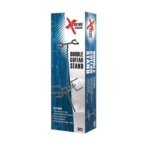 The Xtreme GS22 Double Guitar Stand securely holds two guitars, making it perfect for stage, studio or home use. With padded supports, non-slip feet and a foldable design, it offers safe, convenient storage for both acoustic and electric guitars.
